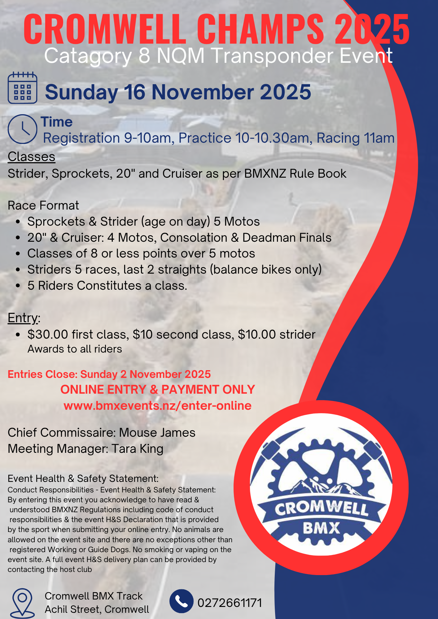 Entries: ONLINE ENTRIES ONLY www.bmxevents.nz/enter-online/