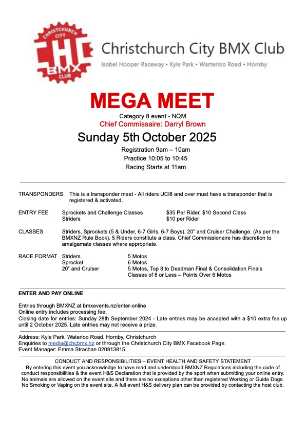 Entries: Online only: https://bmxevents.nz/enter-online