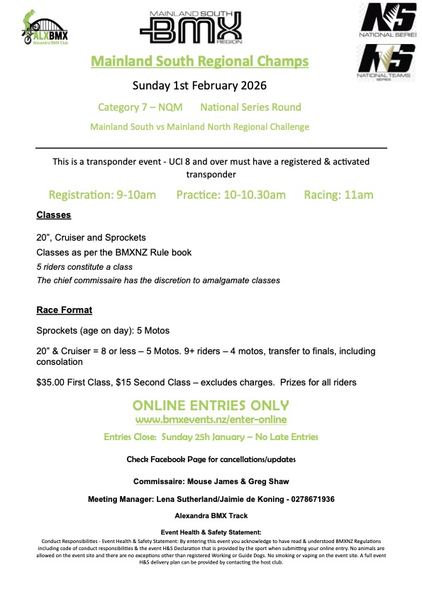 Entries: ONLINE ENTRIES ONLY www.bmxevents.nz/enter-online/
