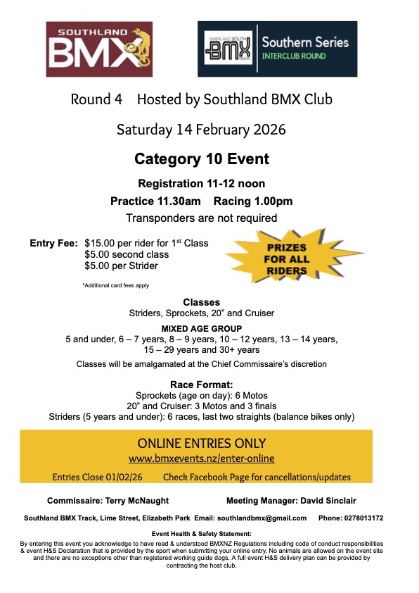 Round 4 Hosted by Southland BMX Club Category 10 Meeting